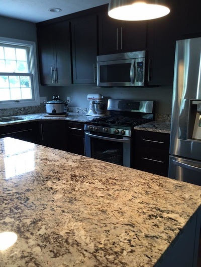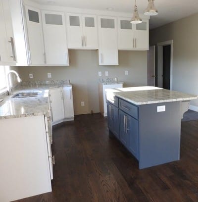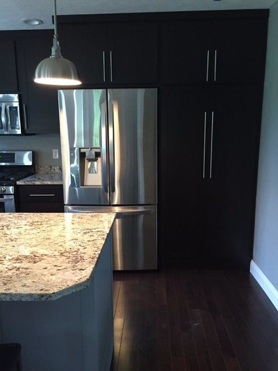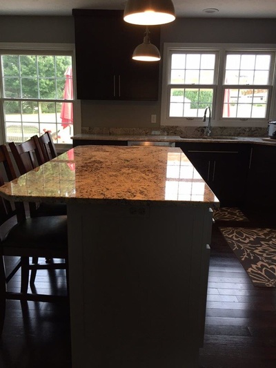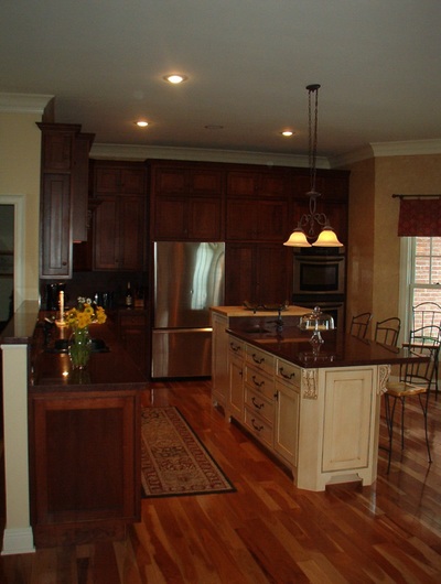 Dark Classic Contemporary Cabinets with White Island and Granite Countertops