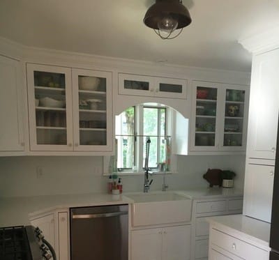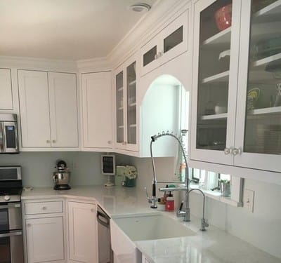 Angel White Maple Cabinets with Dupont Zodiac Coarse Carrara Quartz Countertops and Farmhouse Sink